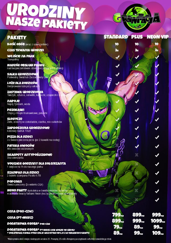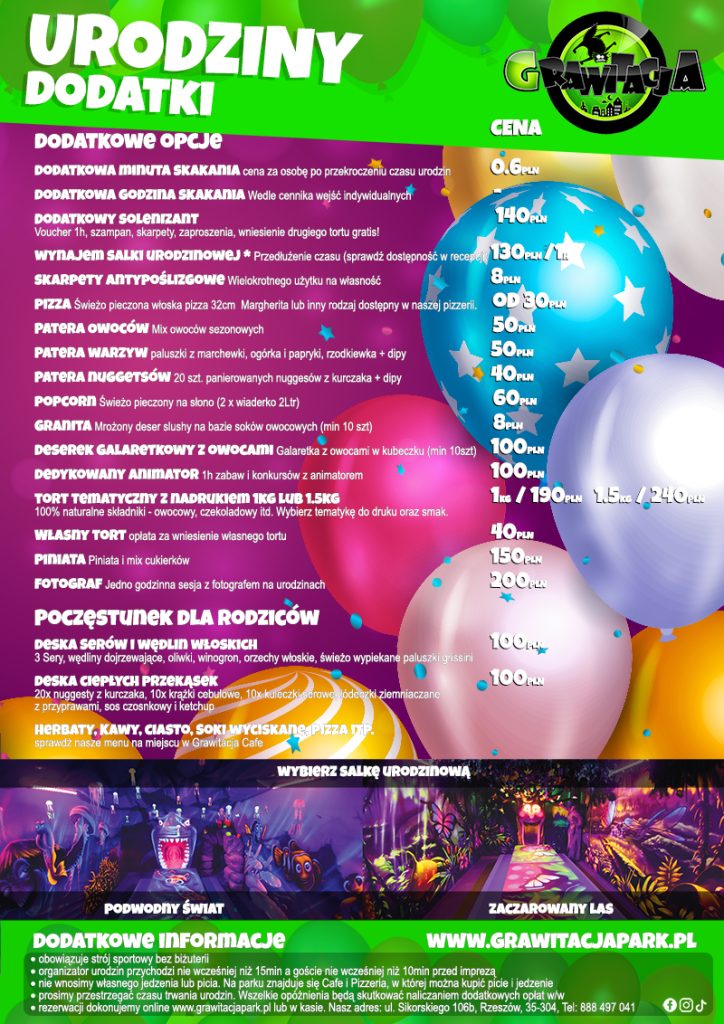 Daj szanse Twemu dziecku sie wyszaleć z przyjaciółmi w mega odlotowej atmosferze pełne 2 godziny na trampolinach, parku linowym, basenach gąbek, ściankach wspinaczkowych itp.. Zaskocz dziecko GRAWITACJĄ !!!UWAGA: urodziny odbywaja sie puntkualnie o godzinie w jakiej zostały zarezerwowane. Prosimy wszystkich o przybycie 10-15 minut przed czasem. Wszelkie opóźnienia skrócą czas zabawy ponieważ salki wymagają posprzątania i przygotowania do kolejnej imprezy